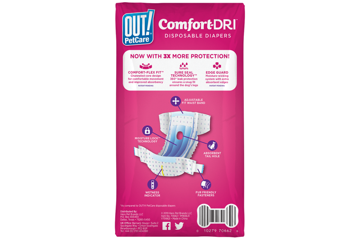 • Технология Sure Seal™: подгузники OUT! XSmall/Small Disposable Fashion Diapers обеспечивают идеальное комфортное прилегание, что делает невозможным протекание в периоды течки или при недержании мочи.