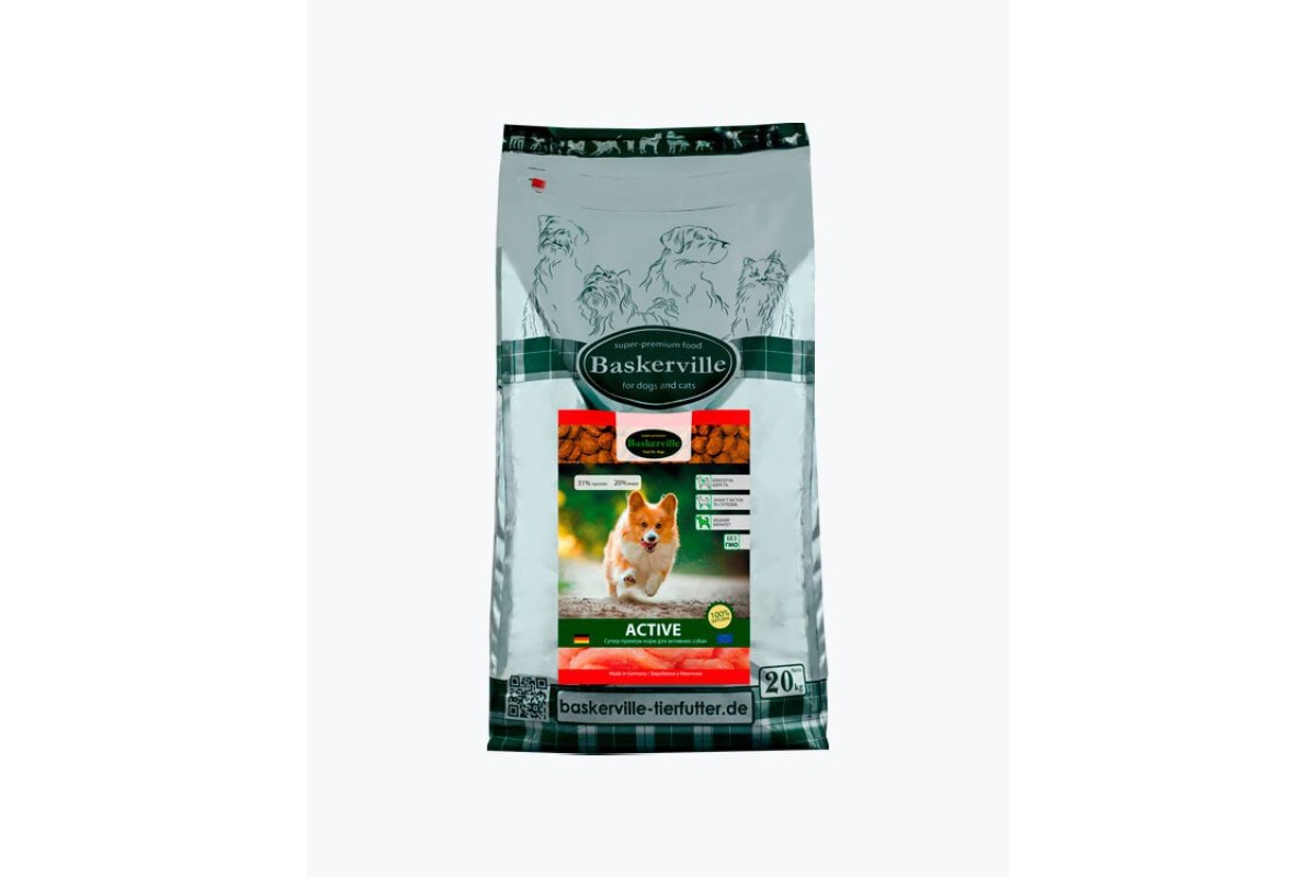 Сухой корм для активных собак супер премиум класса Baskerville Active. Специальное питание для активных собак. Данный корм повышает производительность вашей собаки в период интенсивной деятельности, увеличивая поступления высококачественных белков, жиров и богатых полиненасыщенных жирных кислот.