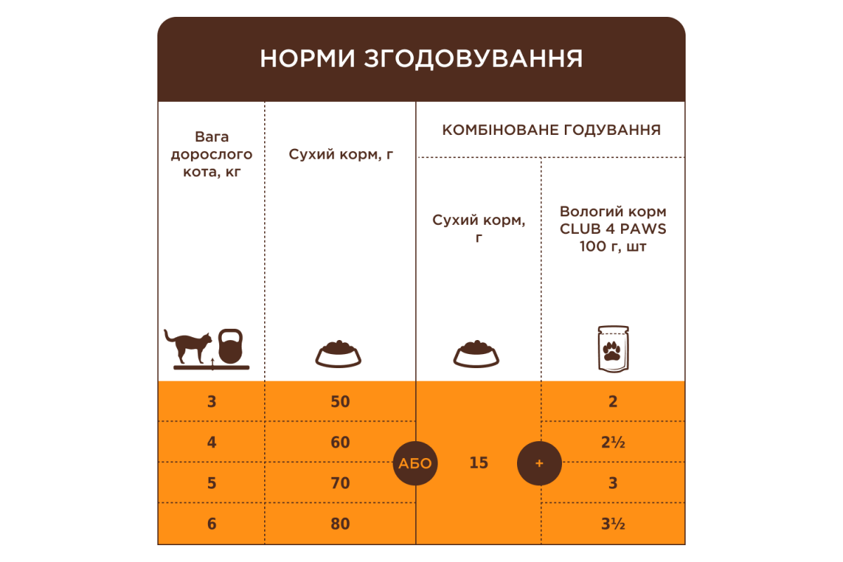 Рекомендации по скармливанию: Корм необходимо вводить в рацион постепенно (по крайней мере, в течение первых 5-ти d (дней)). Обеспечьте постоянный доступ к чистой свежей питьевой воде. Индивидуальные нормы кормления могут изменяться в зависимости от возраста, породы, уровня активности и окружающей среды. Комбинируйте кормление с влажными кормами CLUB 4 PAWS для взрослых кошек.