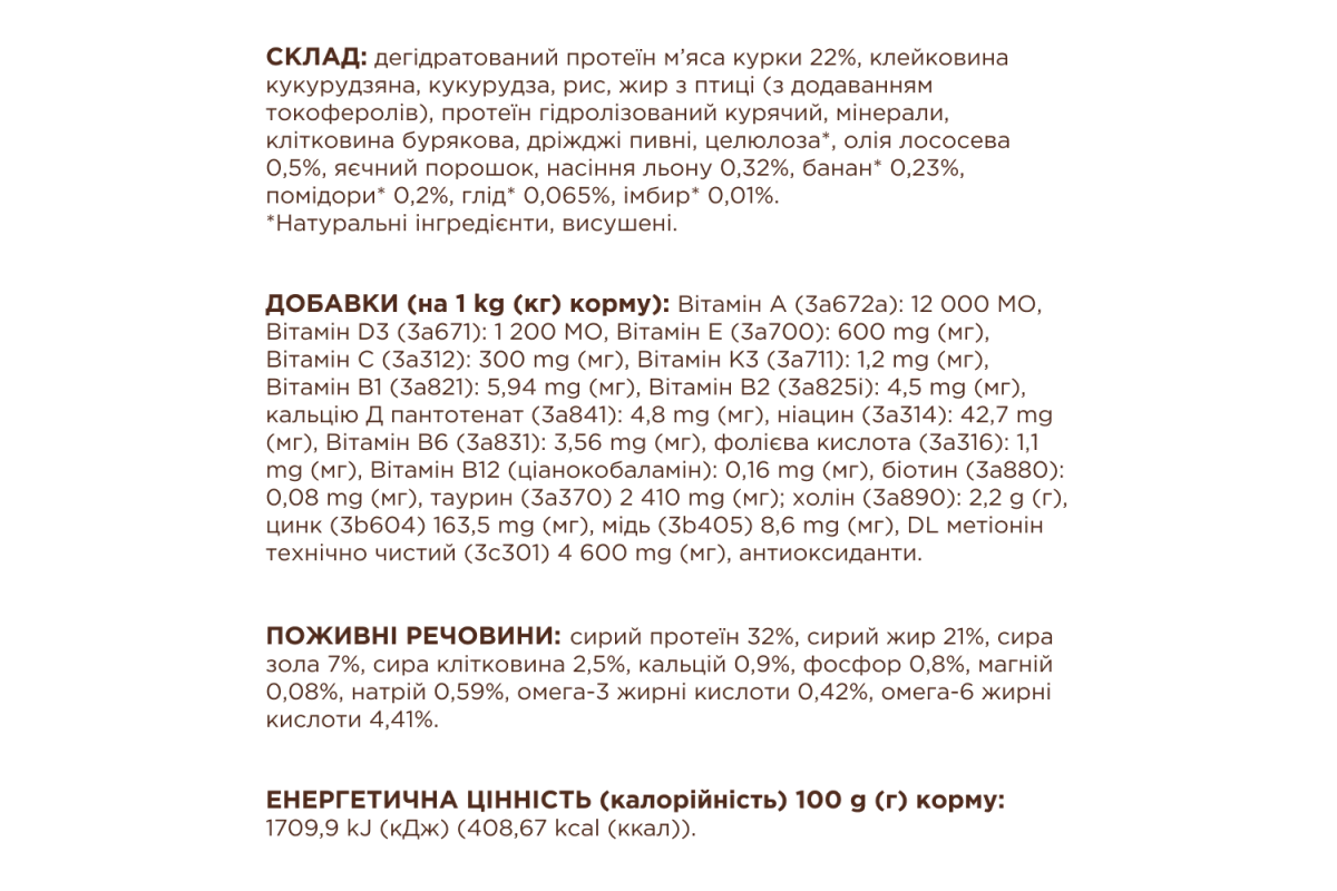 Добавки (на 1 кг (кг) корма): Витамин А (3а672а): 12 000 МЕ, Витамин D3 (3а671): 1 200 МЕ, Витамин Е (3а700): 600 mg (мг), Витамин С (3а300): 30 (3а710): 1,2 mg (мг), Витамин В1 (3а820): 5,94 mg (мг), Витамин В2 (рибофлавин): 4,5 mg (мг), кальция Д пантотенат (3а841): 4,8 mg (мг), ниацин (3а3 (3а831): 3,56 mg (мг), фолиевая кислота (3а316) 1,1 mg (мг), Витамин В12 (цианокобаламин): 0,16 mg (мг), биотин (3а880) 0,08 mg (мг), холин хлорид (3а цинк (3b604) 163,5 mg (мг), медь (3b405) 8,6 mg(мг), таурин (3a370) 2400 mg (мг), DL-метионин (3c301) 4 600 mg (мг), антиоксиданты, консервант. *Натуральные ингредиенты, высушенные.