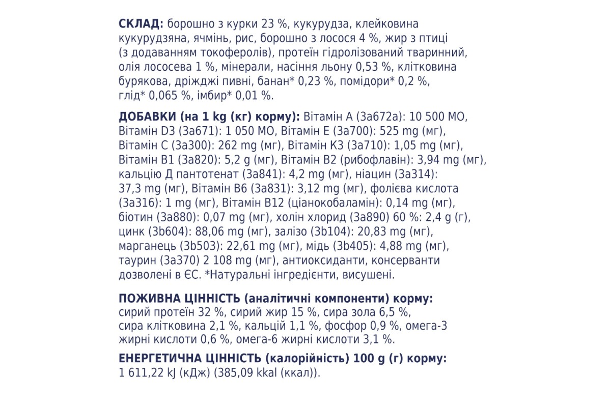 Состав: Мука из курицы 23%, кукуруза, клейковина кукурузная, ячмень, рис, мука из лосося 4%, жир из птицы (с добавлением токоферолов), протеин гидролизованный животный, масло лосося 1%, минералы, семена льна 5 пивные, банан*0,23%, помидоры*0,2%, боярышник*0,065%, имбирь*0,01%.