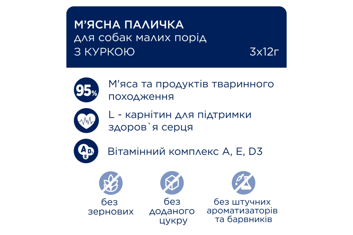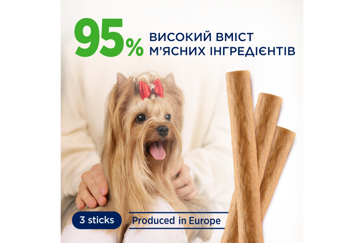 Лакомство для собак в виде мясной палочки содержит 95% мясных ингредиентов (в том числе 30% из курицы) и витаминный комплекс A, E, D3 и L-карнитин. Беззерновые палочки изготовлены без использования сахара, сои, искусственных ароматизаторов и красителей. Для максимальной сохранности свежести продукта, каждая палочка упакована в индивидуальную металлизированную упаковку. Вкус может быть идеальным вознаграждением за выполнение команд на прогулке или в путешествии, а также как перекусом между приемами пищи.