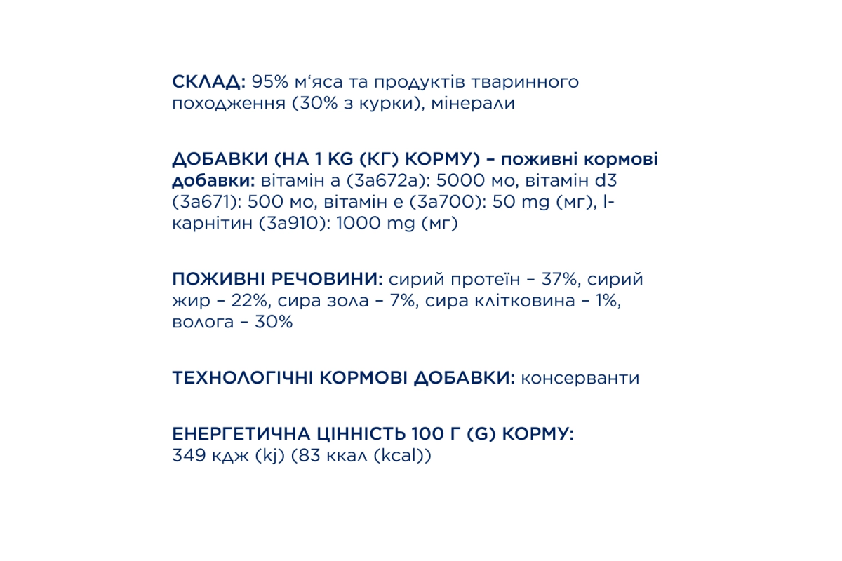 Энергетическая ценность 100 г(g) корма: 349 кДж(kJ) (83 ккал(kcal)).