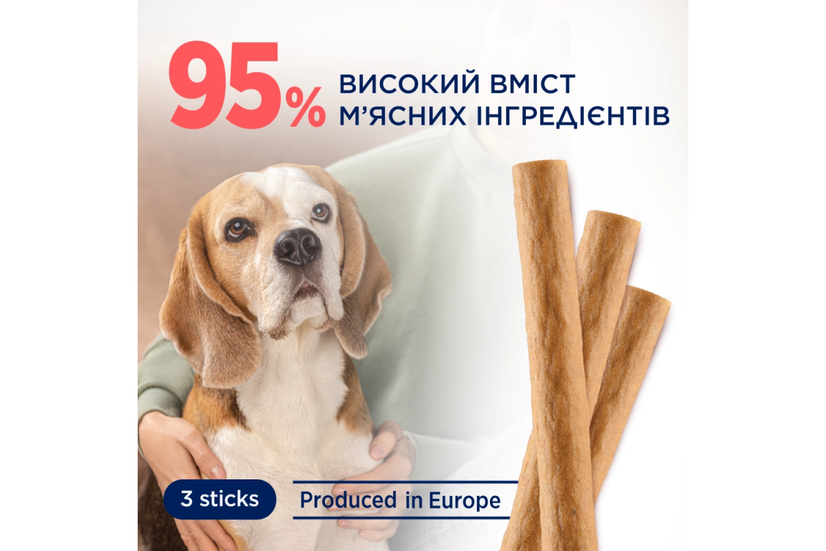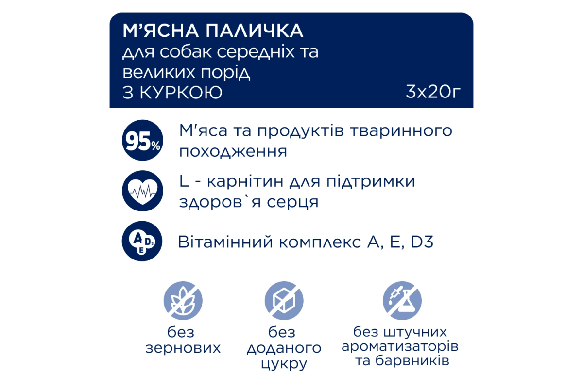 Лакомство для собак в форме мясной палочки содержит 95% мясных ингредиентов (включая 30% курицы) и витаминный комплекс A, E, D3 и L-карнитин. Мясная палочка для взрослых собак средних и больших пород весит 20 г, что идеально подходит для собак весом более 10 кг. Беззерновые палочки производятся без использования сахара, сои, искусственных ароматизаторов и красителей. Для максимальной сохранности свежести продукта каждая палочка упакована в индивидуальную металлизированную упаковку. Лакомство может быть идеальной наградой за выполнение команд во время прогулок или путешествий, а также перекусом между приемами пищи.