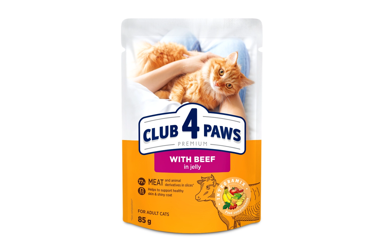 - Клуб 4 Лапы влажный корм с говядиной в желе для кошек обогащен полезными добавками;