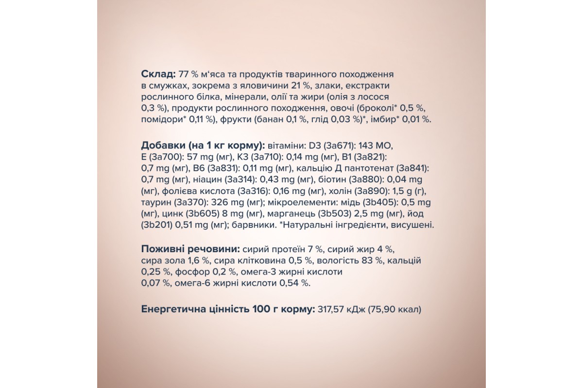 Состав: 77 % мяса и продуктов животного происхождения в полосках, в частности из говядины 21 %, злаки, экстракты растительного белка, минералы, масла и жиры (масло из лосося 0,3 %), продукты растительного происхождения, овощи (брокколи* 0,5 %, 1 %, боярышник 0,03%)*, имбирь* 0,01%.