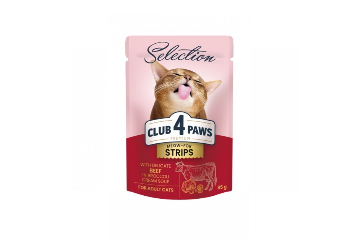 Влажный корм Club 4 Paws (Клуб 4 лапы) Selection, для взрослых кошек, с полосками говядины в крем-супе из брокколи, 85 г