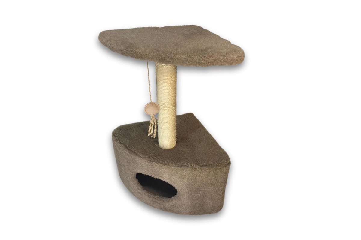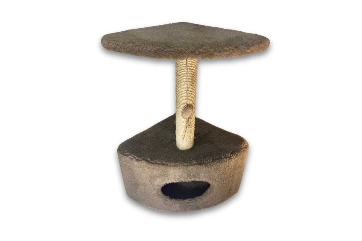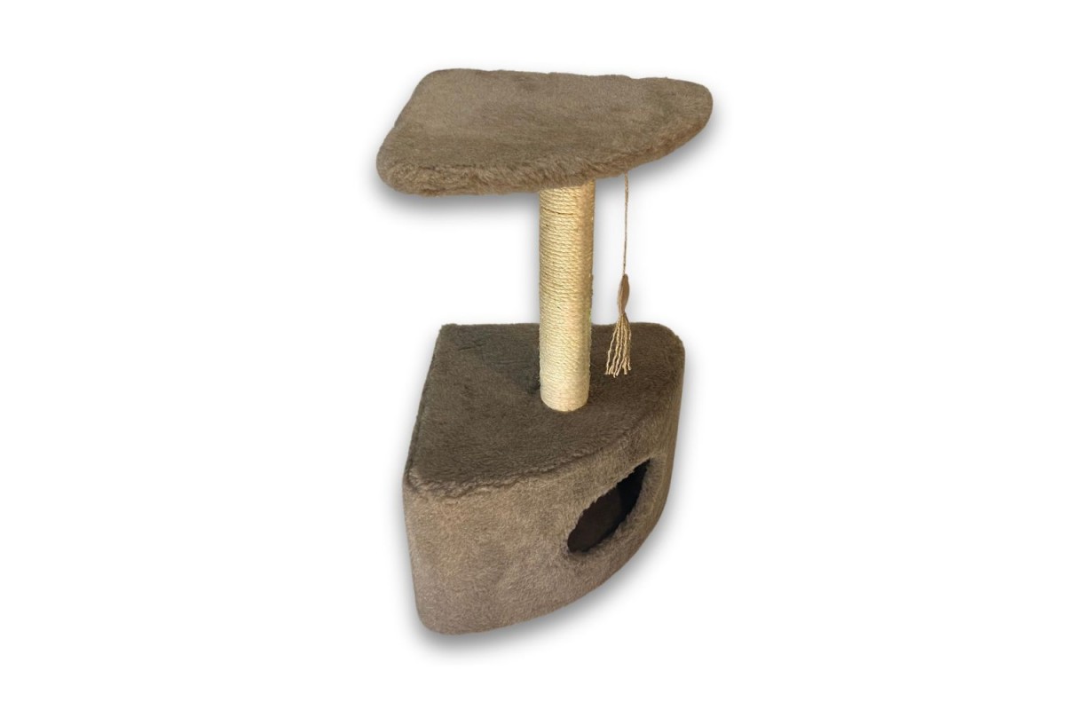 Угловая дряпка-домик занимает немного места, устойчива и больше похожа на оригинальный элемент интерьера, чем на игрушку или дом для кота. В домике кот сможет укрыться от суеты и шума, отдохнуть в прохладную погоду. В остальное время любимцы предпочитают величественно сидеть на площадке, надежно закрепленной на столбике-царапке.