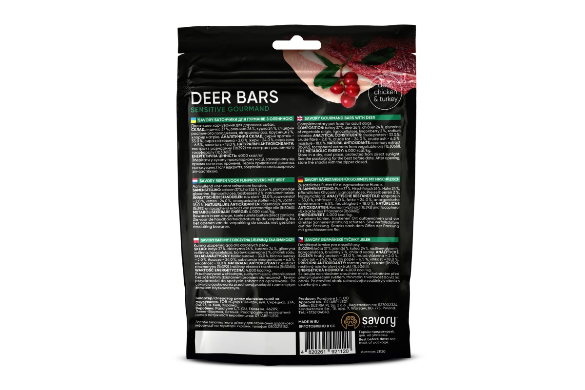 Состав: мясо и мясные продукты индейка 37 %, оленина 26 %, курица 24 %, глецерин растительного происхождения, лигноцелюлоза, брусника 2 %, хлорид натрия.