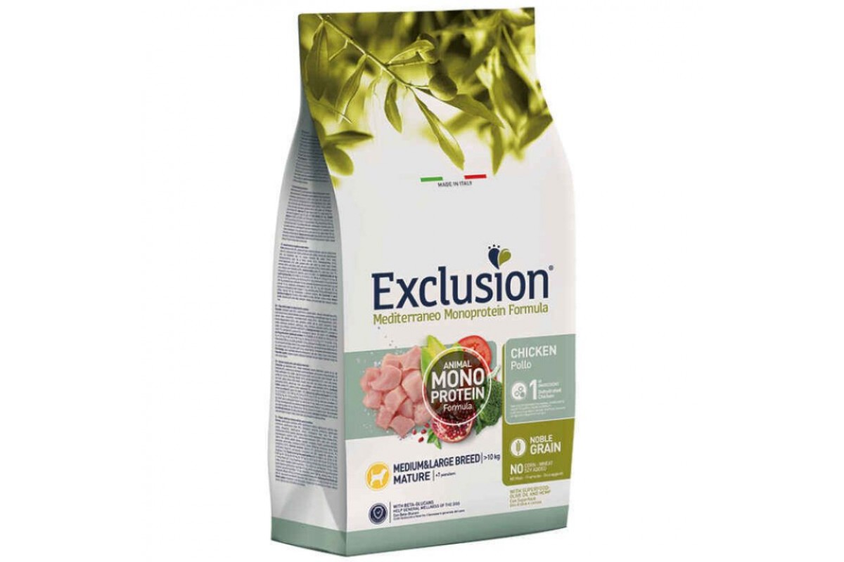 Монопротеиновый рацион на основе белка животного происхождения с курицей для взрослых собак средних и крупных пород от 7 лет Exclusion Mediterraneo Monoprotein Formula – полнорационный сбалансированный корм на основе высококачественного зерна и дегидрированного монопротеина животного происхождения. Содержит только натуральные антиоксиданты и β-глюканы. Рецептура корма разработана в лучших средиземноморских традициях и включает в себя коноплю, оливковое масло, помидоры, гранат, брокколи и цикорий. Не содержит куриного жира, пшеницы, сои и кукурузы.