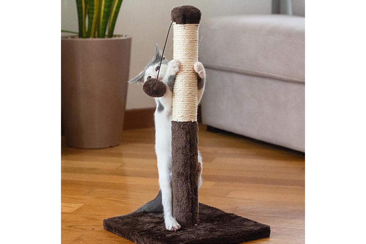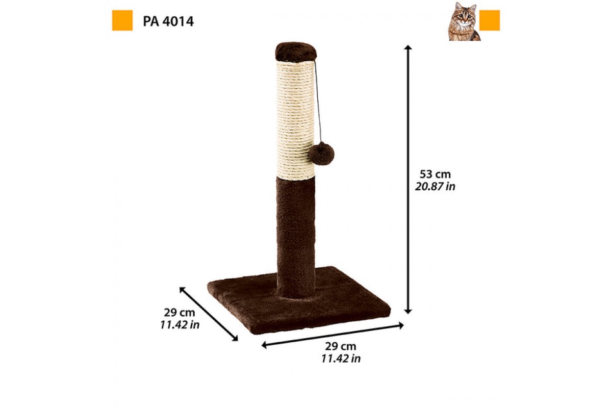 Практичная когтеточка базового дизайна имеет высоту 40 см. Размещается на подставке с покрытием из ткани, столбик для затачивания когтей изготовлен из сизаля. Сверху расположена игрушка-мячик, которая привлечет внимание даже самых ленивых кошек.