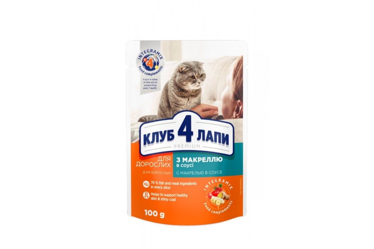 Питательный влажный рацион Club 4 Paws с макрелью в соусе для взрослых кошек подарит радость вашему любимцу!