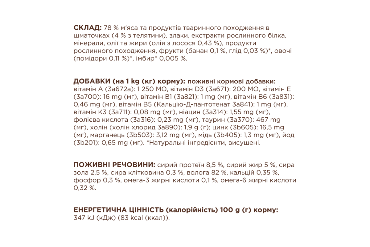 78% мяса и продуктов животного происхождения в кусочках, в частности из телятины 9%, злаки, экстракты растительного белка, минералы, масла и жиры (масло из лосося 0,22%), фрукты (банан 0,1%, боярышник 0,03%)*, овощи* 0,005%.