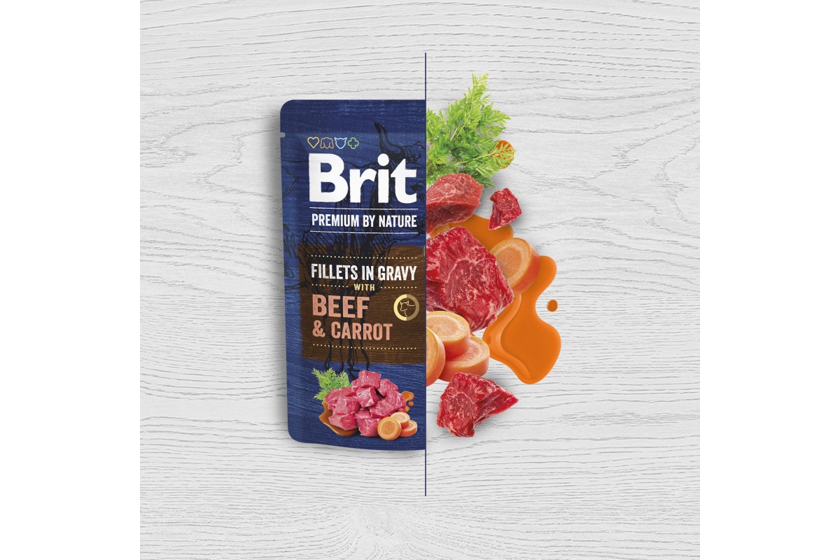 Brit Premium Fillets in Gravy Beef & Carrot – это премиальный влажный корм для собак. Он содержит 85% филе отборного мяса и самые полезные овощи, которые являются важной частью сбалансированной диеты для здоровья и бодрости любимцев. Также этот корм станет дополнительным источником влаги для питомцев.