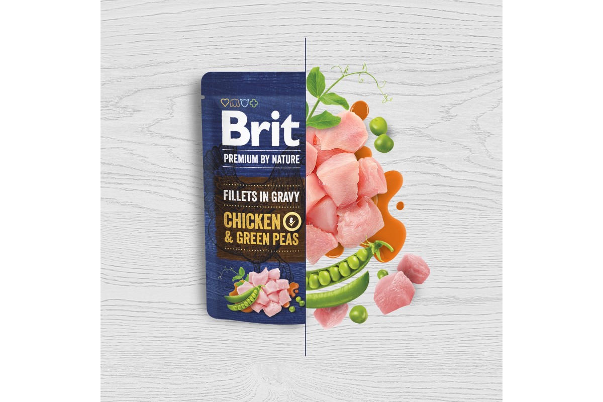 Brit Premium Fillets in Gravy Chicken & Green Peas – это премиальный влажный корм для собак. Он содержит 85% филе отборного мяса и самые полезные овощи, которые являются важной частью сбалансированной диеты для здоровья и бодрости любимцев. Также этот корм станет дополнительным источником влаги для питомцев.