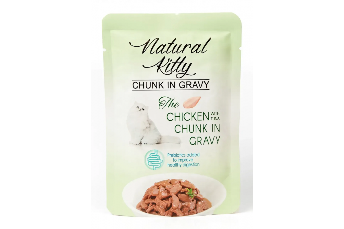 Natural Kitty Chunk In Gravy Chicken And Tuna – полноценный влажный корм, созданный из аппетитных кусочков настоящей курицы, тунца и куриной печени в нежном соусе. У него привлекательная текстура и отличный вкус, который нравится котам. Благодаря сочетанию нескольких источников белка, корм обеспечивает сбалансированное питание, поддерживает здоровье и активность любимца.