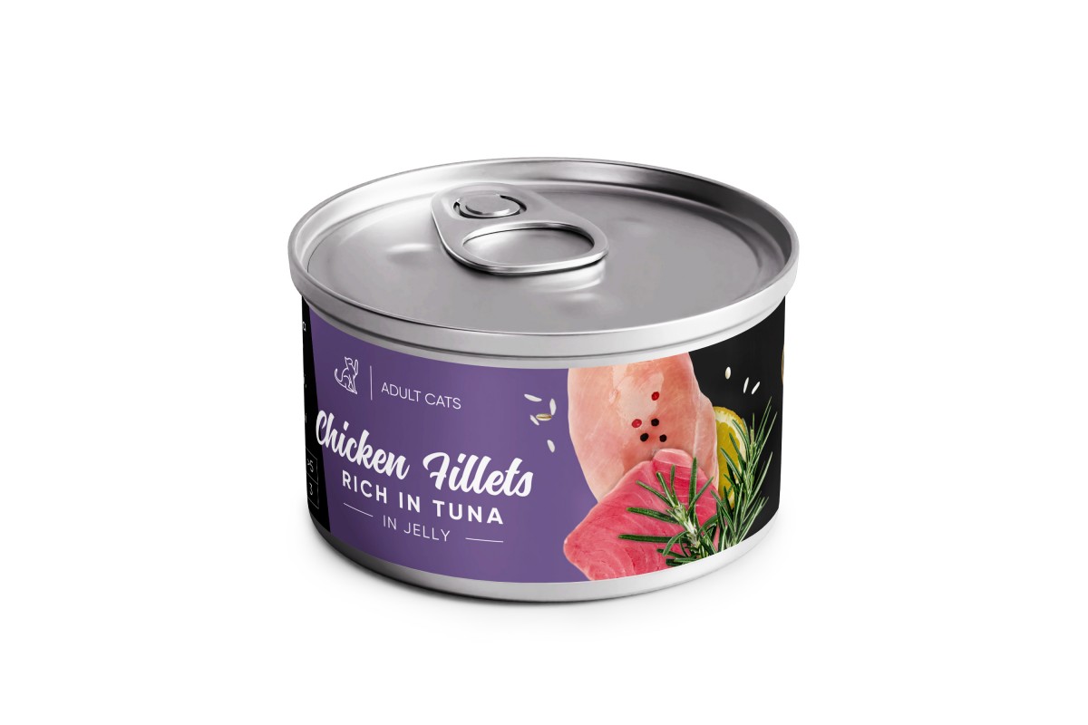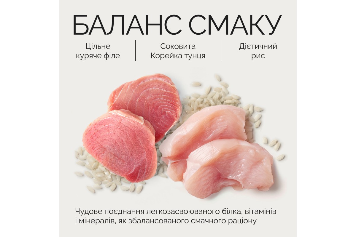 Влажный корм для котов старше 1 года, дополнительное питание. Деликатесные кусочки цельного куриного филе с добавлением сочной корейки тунца и диетического риса.