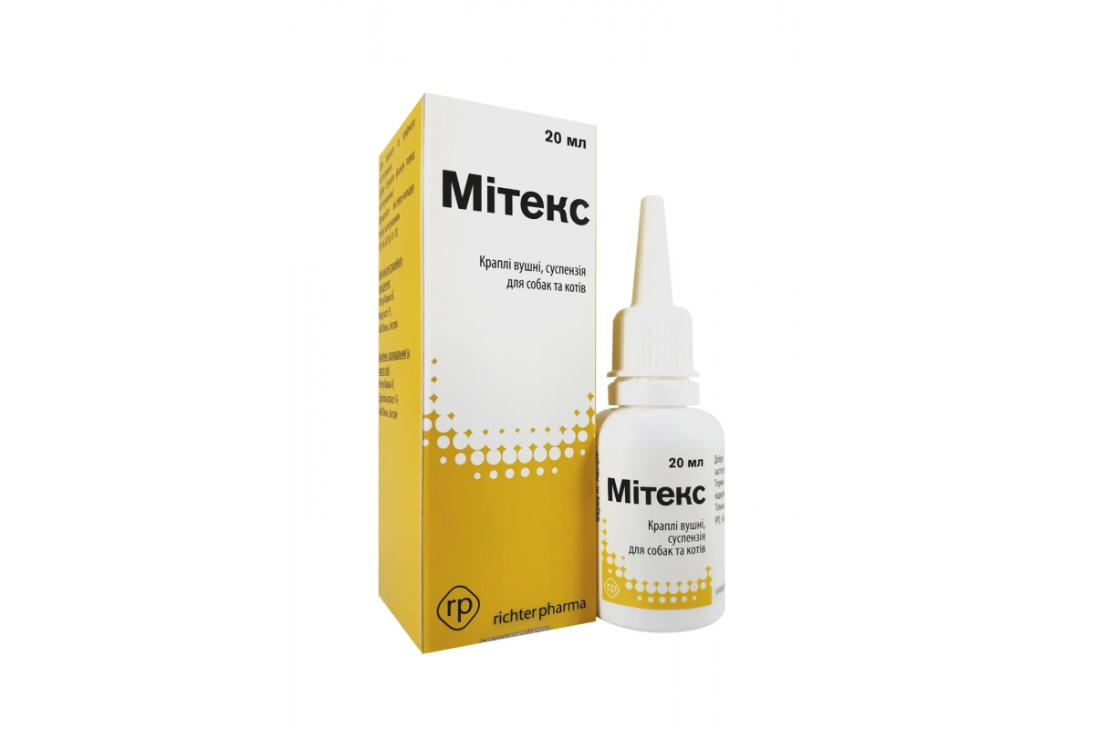 Митекс (Mitex) суспензия, 20 мл - является комплексным ветеринарным препаратом для лечения отитов у кошек и собак. Капли Митекс - это тройная защита от бактерий, дрожжей, клещей и воспалительных симптомов.