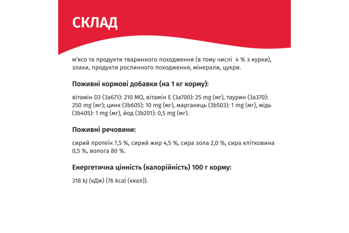 мясо и субпродукты животного происхождения, в том числе курицы не менее 4%, злаки, экстракты растительных белков, минералы, витамины (таурин), сахара, краситель Е171.