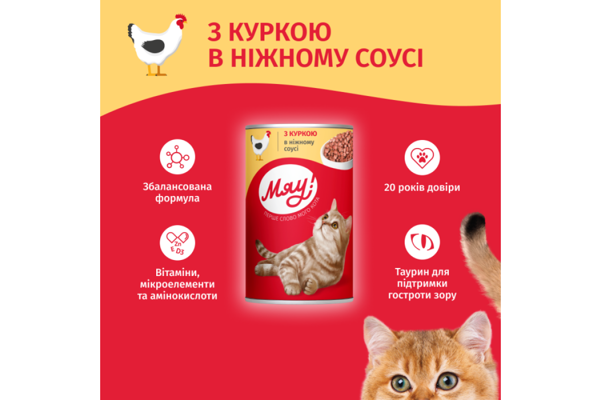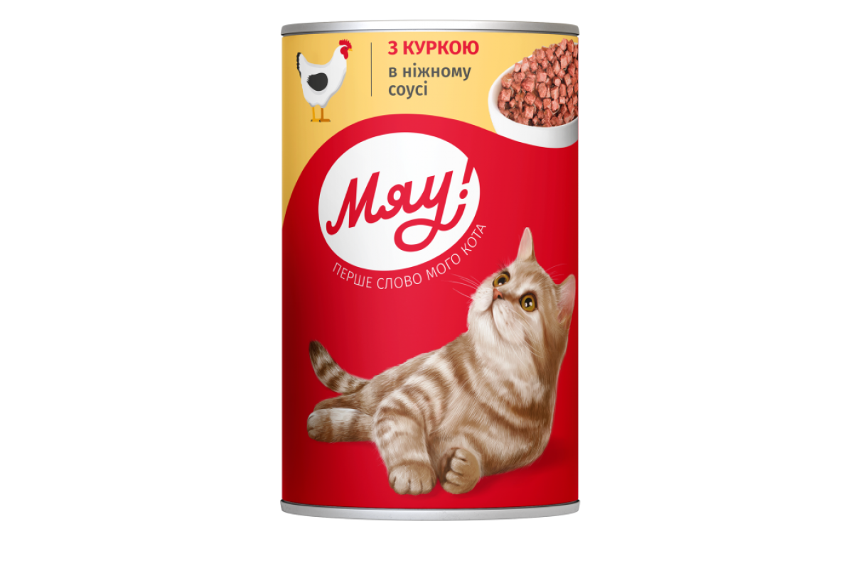 Полнорационный консервированный корм "Мяу" для взрослых кошек с курицей в нежном соусе.