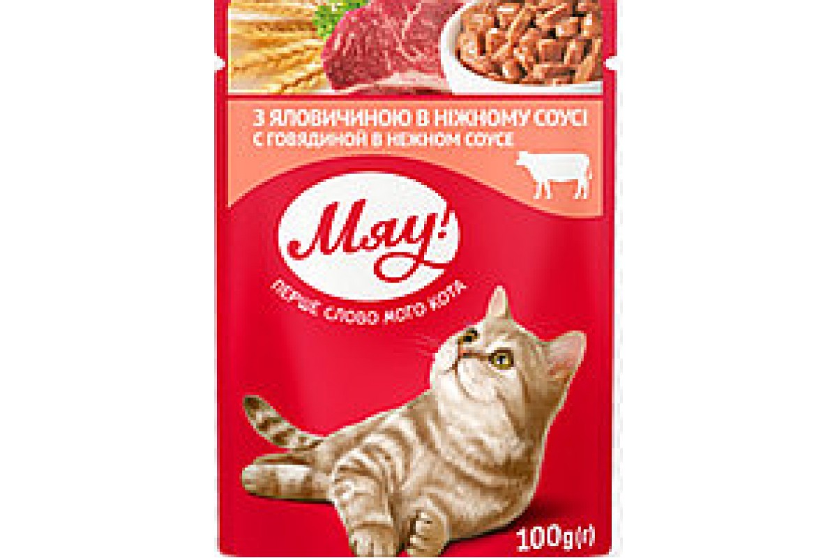 Влажный корм Мяу!, для взрослых кошек, с говядиной в нежном соусе, 100 г