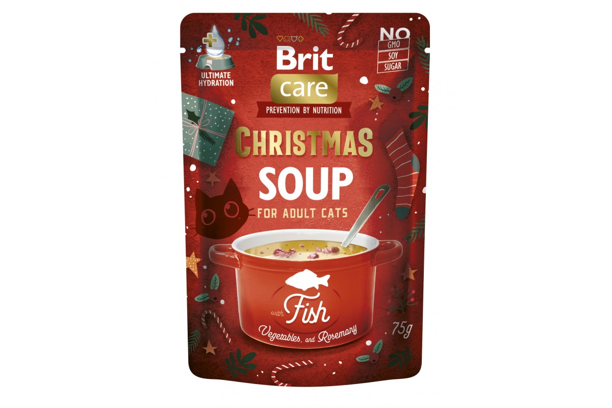 • Влажный дополнительный корм Brit Care Cat Christmas Soup: суп с рыбой, овощами и розмарином.