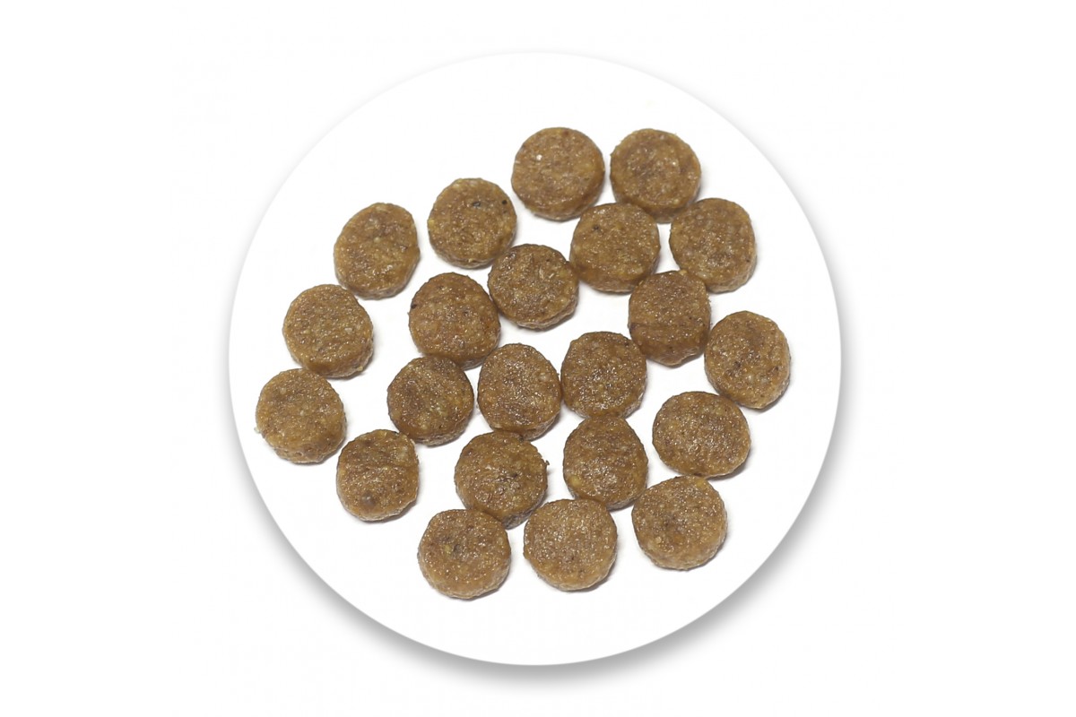 Состав: мясо птицы 38% (сушеные и измельченные), рис, кукуруза, жир птицы, мука из криля (мин. 4%), кукурузный глютен, рыбная мука, семена льна, горох, яичный порошок, жом сахарной свеклы, динамично микронизированный клиноптилолит (1%), гексаметафосфат натрия, экстракт цикория, экстракт юкки.