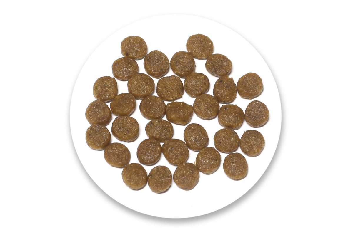 Состав: мясо птицы 42% (сушеные и измельченные), рис, жир птицы, кукуруза, кукурузный глютен, лигноцеллюлоза, пивные дрожжи, гидролизованный куриная печень, лососевое масло, семена льна, яичный порошок, динамично микронизированный клиноптилолит (1%), экстракт цикория, экстракт юкки, дрожжи (бета глюкан), глюкозамин (250 мг / кг), хондроиты сульфат (100 мг / кг).