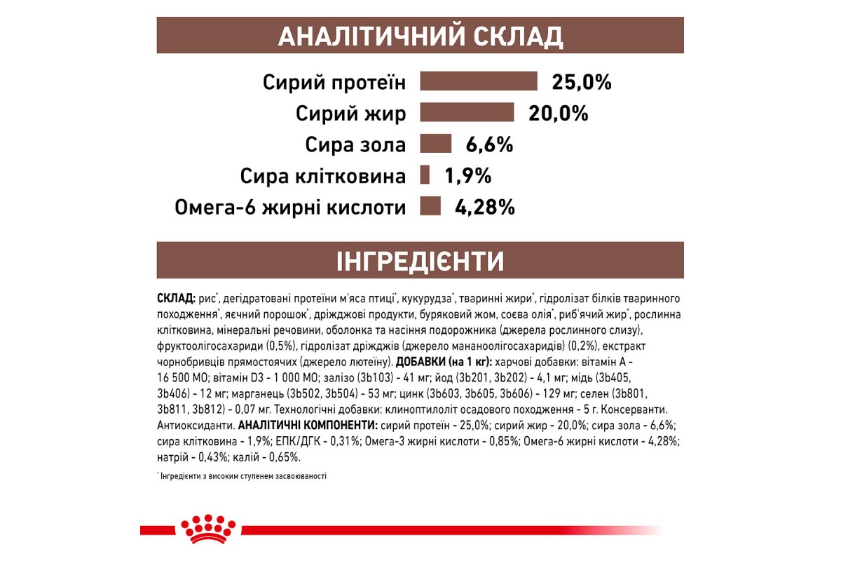 рис*, дегидратированные протеины мяса птицы*, кукуруза*, животные жиры*, гидролизат белков животного происхождения*, яичный порошок*, дрожжевые продукты, свекольный жом, соевое масло*, рыбий жир*, растительная клетчатка, минеральные вещества, оболонь фруктоолигосахариды (0,5%), гидролизат дрожжей (источник мананоолигосахаридов) (0,2%), экстракт бархатцев прямостоящих (источник лютеина).