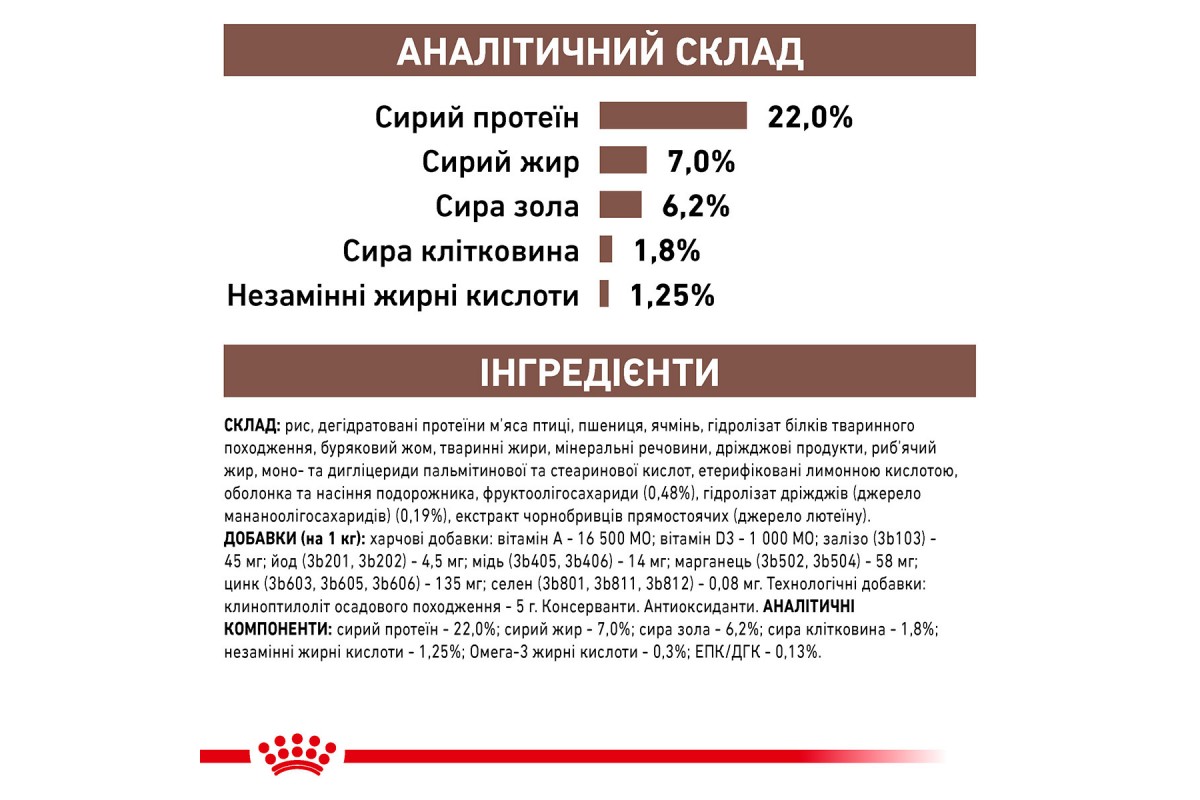рис, дегидратированные протеины мяса птицы, пшеница, ячмень, гидролизат белков животного происхождения, свекловичный жом, животные жиры, минеральные вещества, дрожжевые продукты, рыбий жир, моно- и диглицериды пальмитиновой и стеариновой кислот, этерифицированные лимоном. фруктоолигосахариды (0,48%), гидролизат дрожжей (источник мананоолигосахаридов) (0,19%), экстракт бархатцев прямостоящих (источник лютеина).