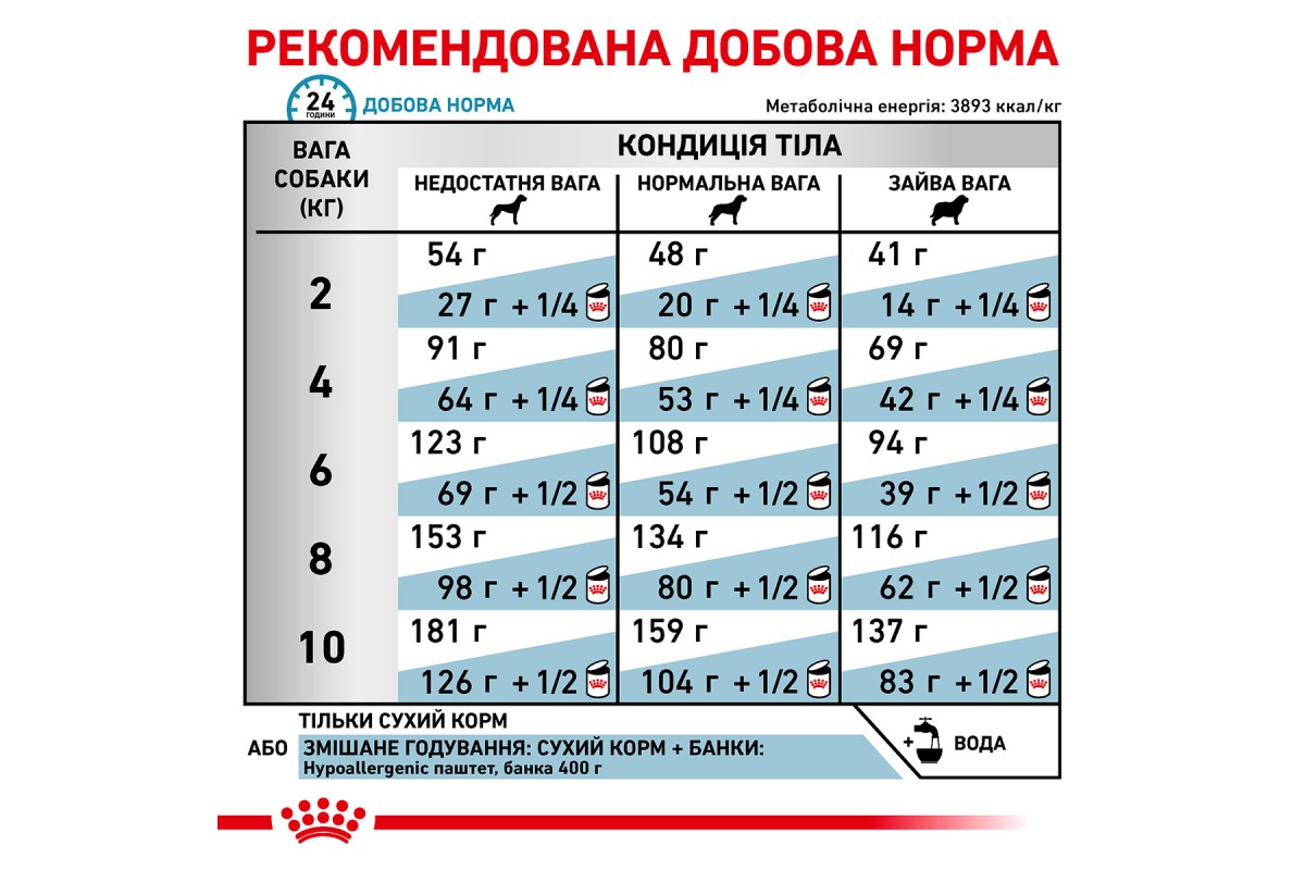 Если подозрение на пищевую аллергию или пищевую непереносимость, рацион может быть изменен сразу без постепенного перехода. Диету HYPOALLERGENIC SMALL DOG можно применять на протяжении всей жизни животного. Рекомендуется разделить суточную норму на 2 приема.