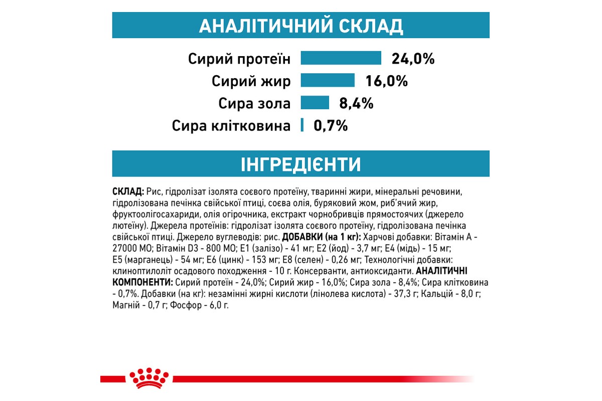 рис, гидролизат изолята соевого протеина, животные жиры, минеральные вещества, гидролизованная печень домашней птицы, соевое масло, свекольный жом, рыбий жир, фруктоолигосахариды, масло огурчика, экстракт бархатцев прямостоящих (источник лютеи) Источники протеинов: гидролизат изолята соевого протеина, гидролизованная печень домашней птицы. Источник углеводов: рис.