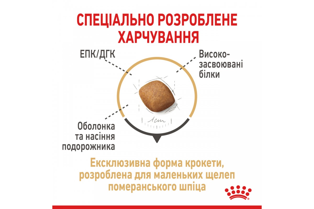 Форма, размер, текстура и формула крокет адаптированы к маленьким челюстям померанского шпица. Формула рациона помогает уменьшить образование зубного камня благодаря специальным веществам, связывающим кальций в слюне (хелаторы кальция).