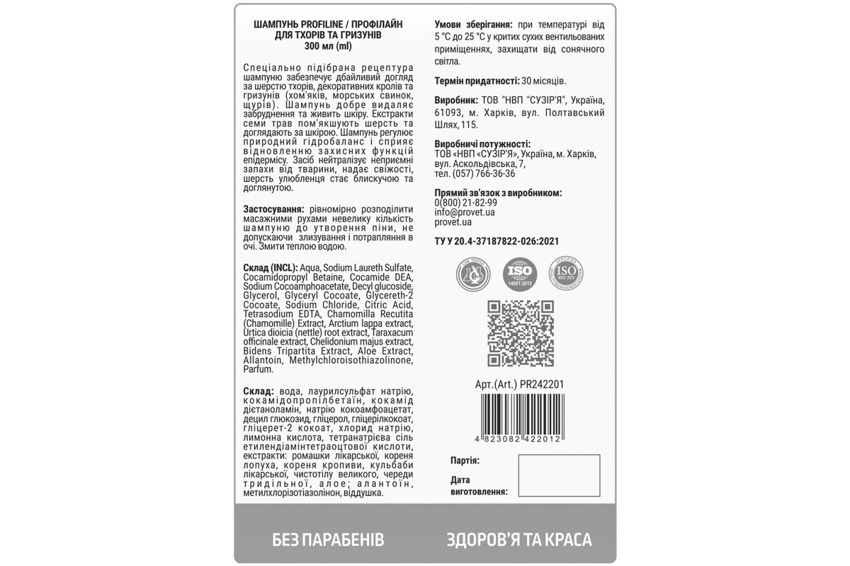 Специально подобранная рецептура шампуня обеспечивает бережный уход за шерстью хорьков, декоративных кроликов и грызунов (хомяков, морских свинок, крыс). Шампунь прекрасно удаляет загрязнение и питает кожу. Экстракты семи трав смягчают шерсть и ухаживают за кожей. Шампунь регулирует естественный гидробаланс и способствует восстановлению защитных функций эпидермиса.