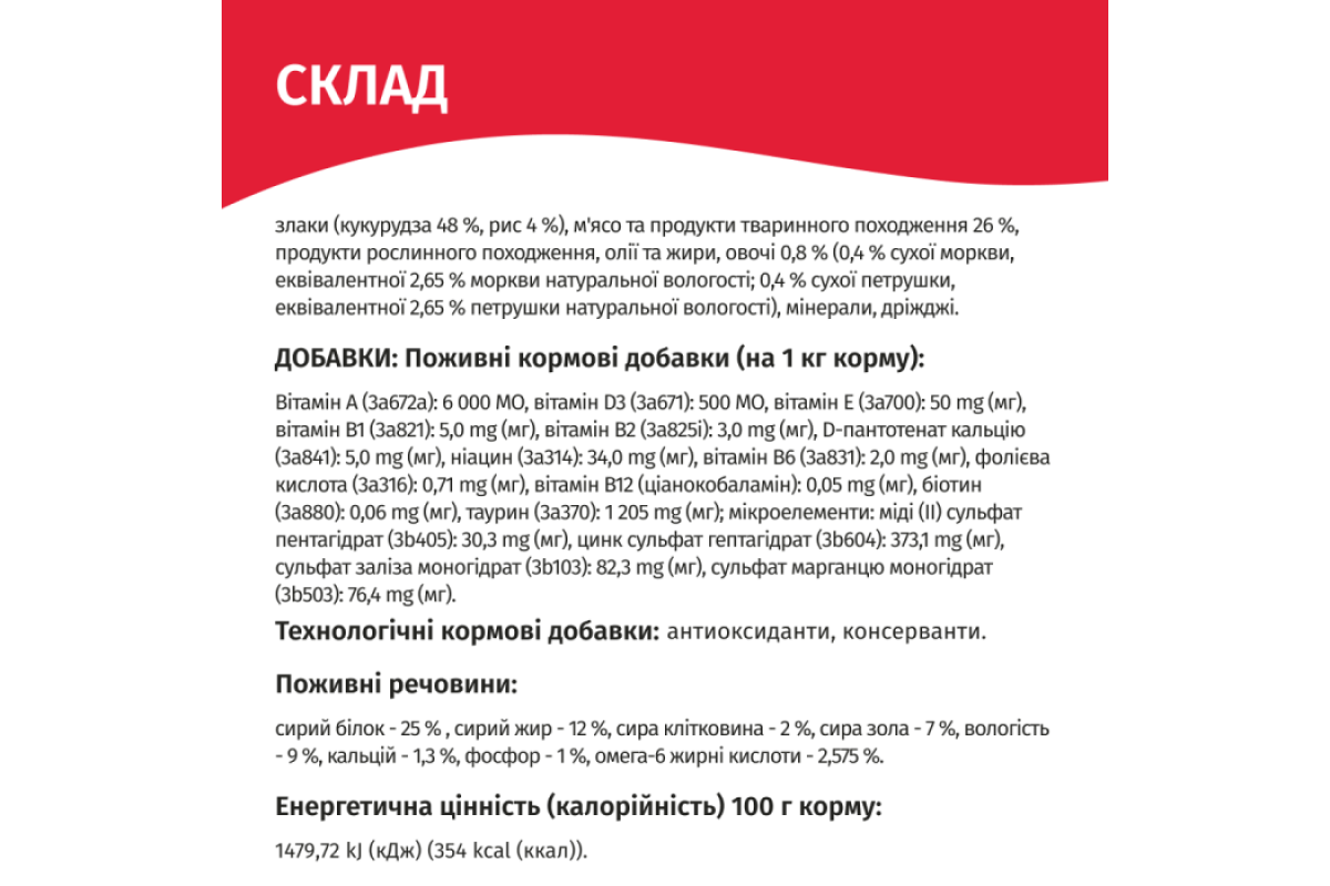 Энергетическая ценность 100 g (г) корма: 1479,72 kJ (кДж) (354 kcal (ккал)).