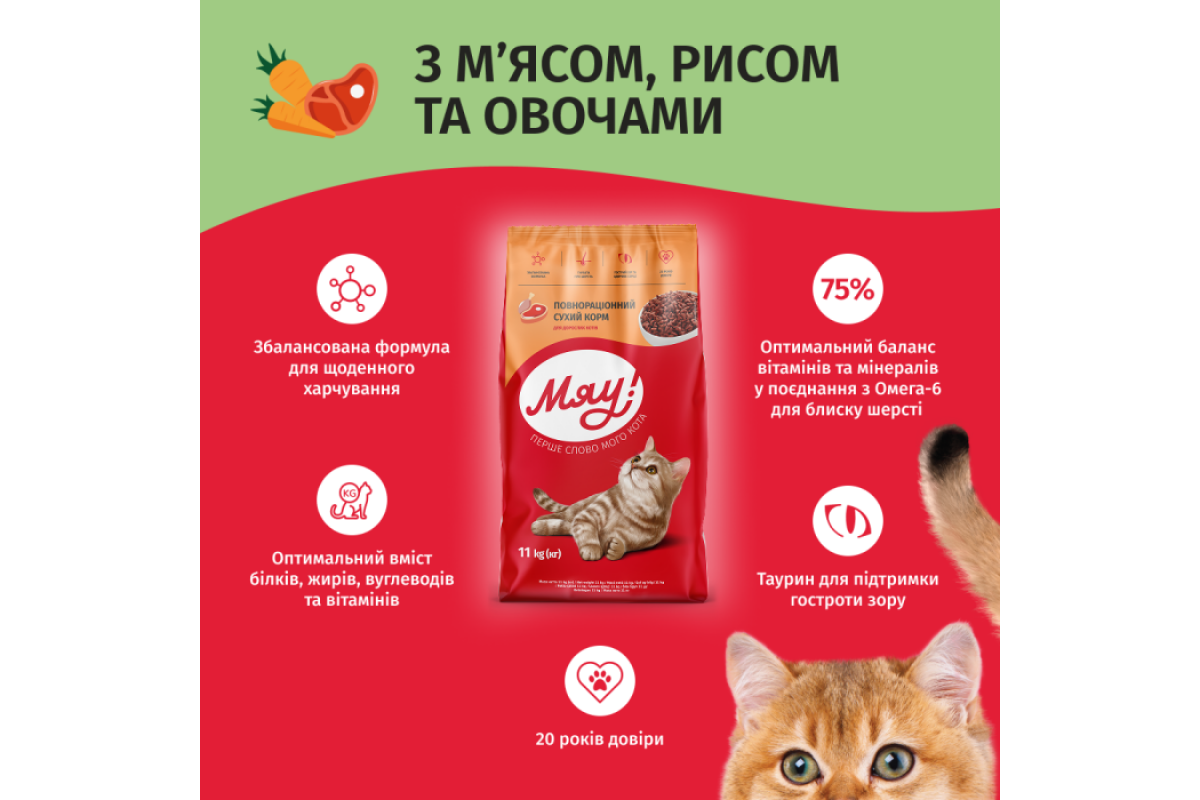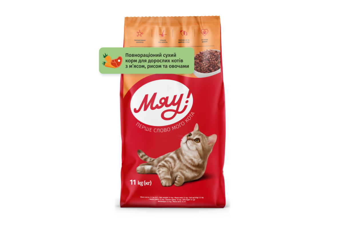 Сухой корм Мяу! для взрослых кошек, мясо, рис, овощи, 11 кг