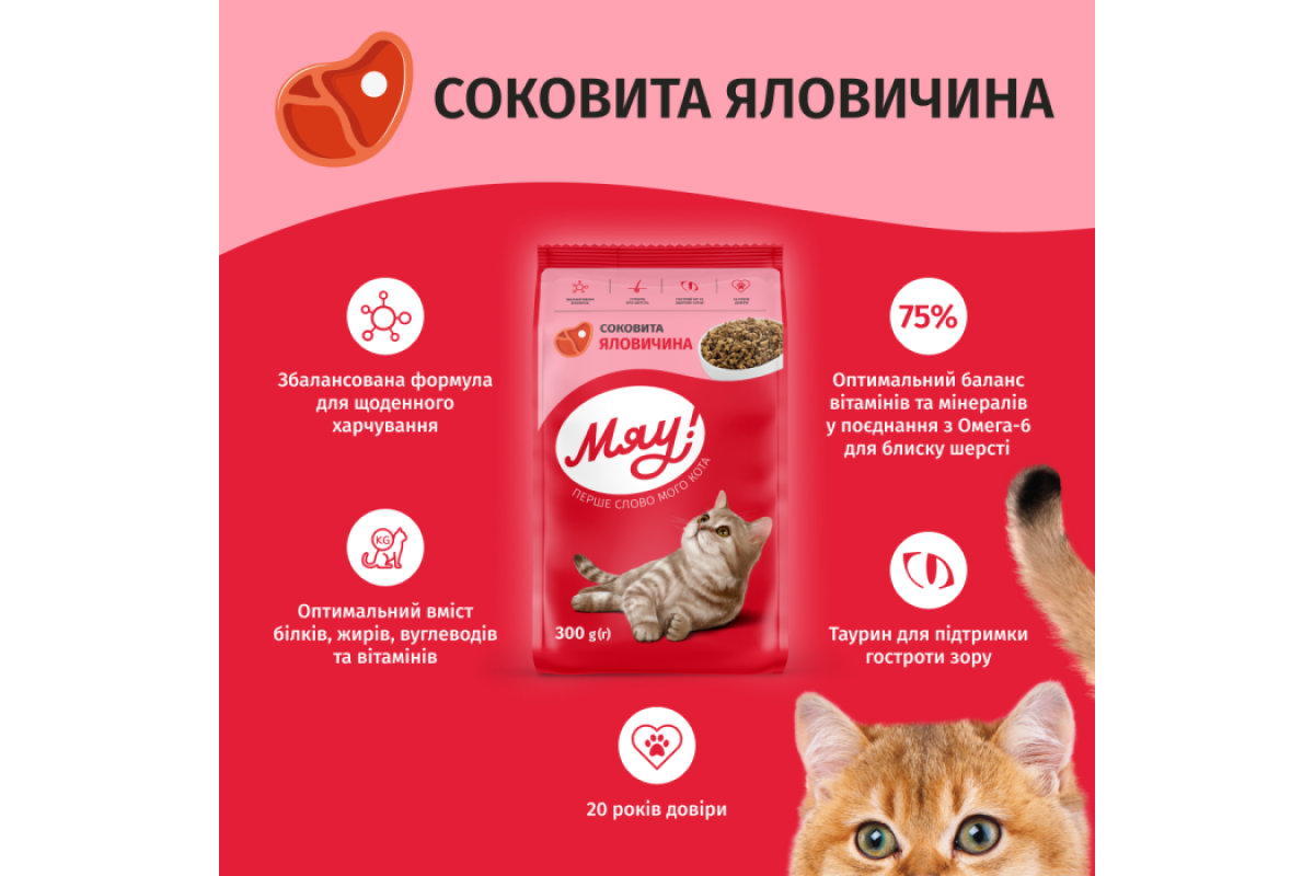 Полнорационный сухой корм Мяу для взрослых кошек говядиной