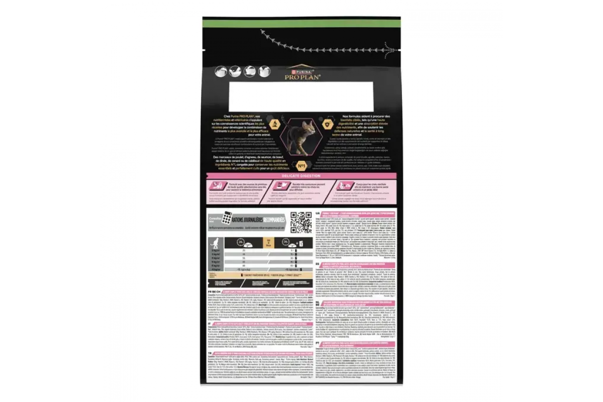 Сухой полнорационный корм PURINA® PRO PLAN® для взрослых стерилизованных кошек с чувствительным пищеварением содержит кусочки с курицей как ингредиентом №1 и другие высокоусвояемые отобранные источники протеина без добавления пшеницы, чтобы помочь облегчить процесс пищеварения кошек. Рацион обладает высокой вкусовой привлекательностью, что может удовлетворить даже самого требовательного кота.