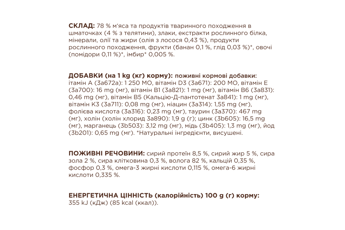 Добавки (на 1 кг (кг) корма): витамины: D3 (3а671): 143 МЕ, Е (3а700): 57 мг (мг), К3 (3а710): 0,14 мг (мг), В1 (3а821): 0,7 мг (мг8,1) кальция Д пантотенат (3а841): 0,7 mg (мг), ниацин (3а314): 0,43 mg (мг), биотин (3а880): 0,04 mg (мг), фолиевая кислота (3а316): 0,16 mg (мг),9 (3а370): 326 мг (мг); микроэлементы: медь (3b405): 0,5 mg (мг), цинк (3b605) 8 mg (мг), марганец (3b503) 2,5 mg (мг), йод (3b201) 0,51 mg (мг); *Натуральные ингредиенты, высушенные.