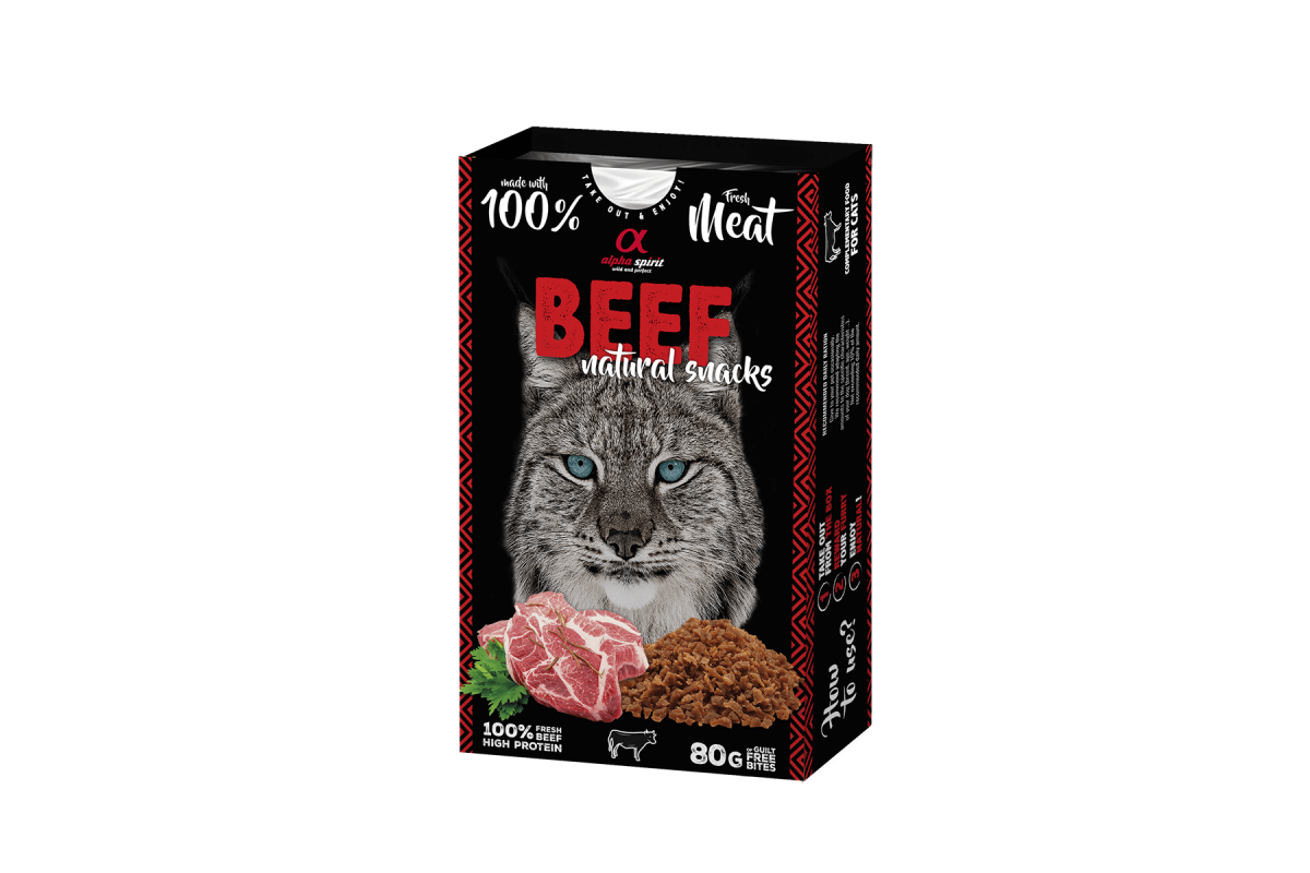 ALPHA SPIRIT Cat Beef Natural Snacks – це надзвичайно м’які, соковиті та апетитні ласощі-снеки для котів, які виготовлені з яловичини, індички, курки та свинячої печінки. Маленькі шматочки ласощів, мають високий вміст якісних протеїнів з м’яса (вміст м’яса 80%) та натуральний склад – це саме те, чим варто пригостити свого улюбленця. Ці ласощі припадуть до смаку навіть найвибагливішим котикам!
