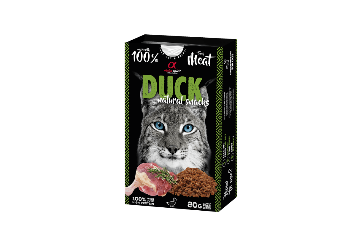 Альфа Спіріт Натурал Снекс виз дак – це надзвичайно м’які, соковиті ласощі-снеки, виготовлені з качки, курятини та свинини.
