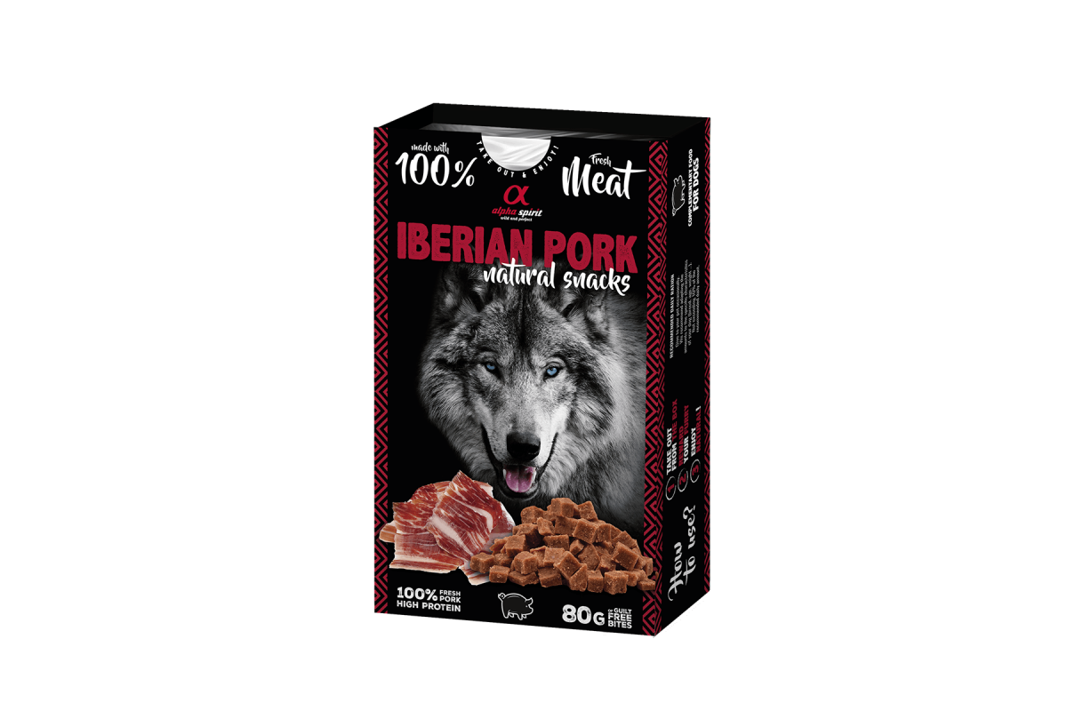 Альфа Спіріт Натурал Снекс виз Іберіан Порк – це надзвичайно м’які, соковиті ласощі-снеки, виготовлені іберійської свинини, шинки та курятини.