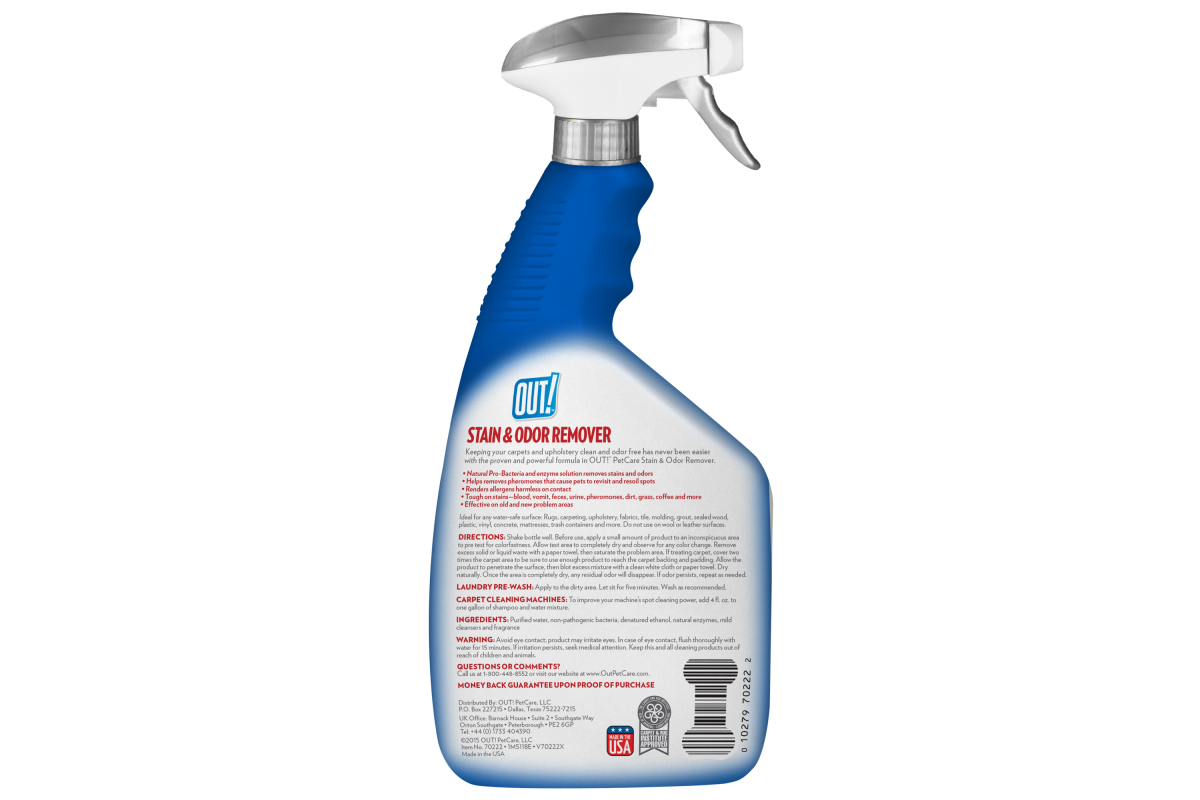 Ніщо не може зіпсувати день так, як пляма яку залишив ваш улюбленець на світлому килимі або на улюбленому дивані. OUT! Pet Stain and Odor Remover засіб для видалення плям та засобів від життєдіяльності тварин створений для того щоб виправити навіть найгірші випадки.