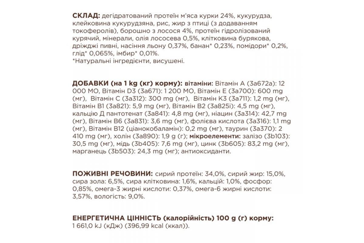 ПОЖИВНІ РЕЧОВИНИ: сирий протеїн: 34,0 %, сирий жир: 15,0 %, сира зола: 6,5 %, сира клітковина: 1,6 %, кальцій: 1,0 %, фосфор: 0,85 %, омега-3 жирні кислоти: 0,37 %, омега-6 жирні кислоти: 3,57 %, вологість: 9,0%.