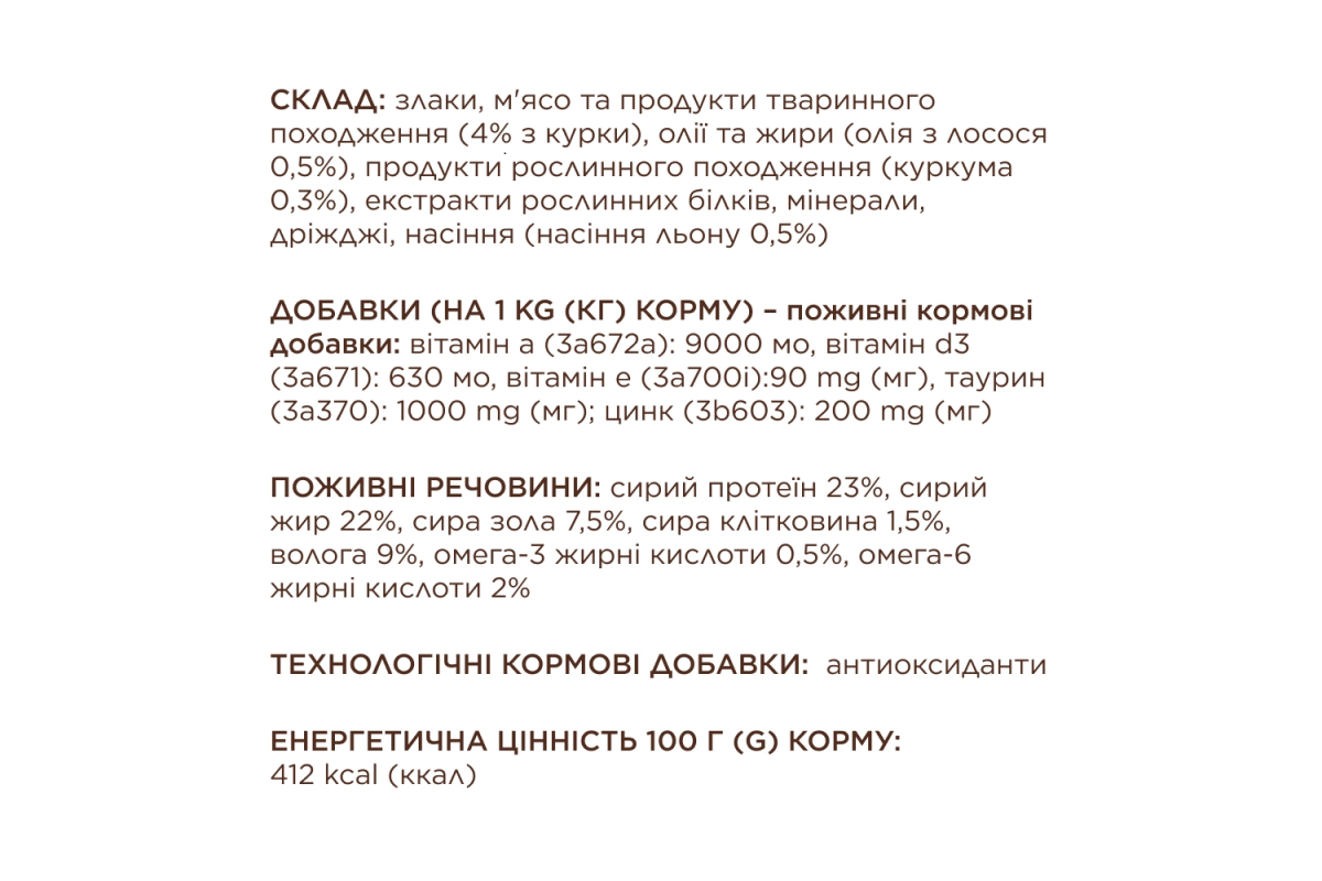 Добавки (на 1 kg (кг) корму): Поживні кормові добавки: вітамін А (3а672а): 9000 МО, вітамін D3 (3а671): 630 МО, вітамін Е (3а700i): 90 mg (мг), таурин (3а370): 1000 mg (мг); цинк (3b603): 200 mg (мг).