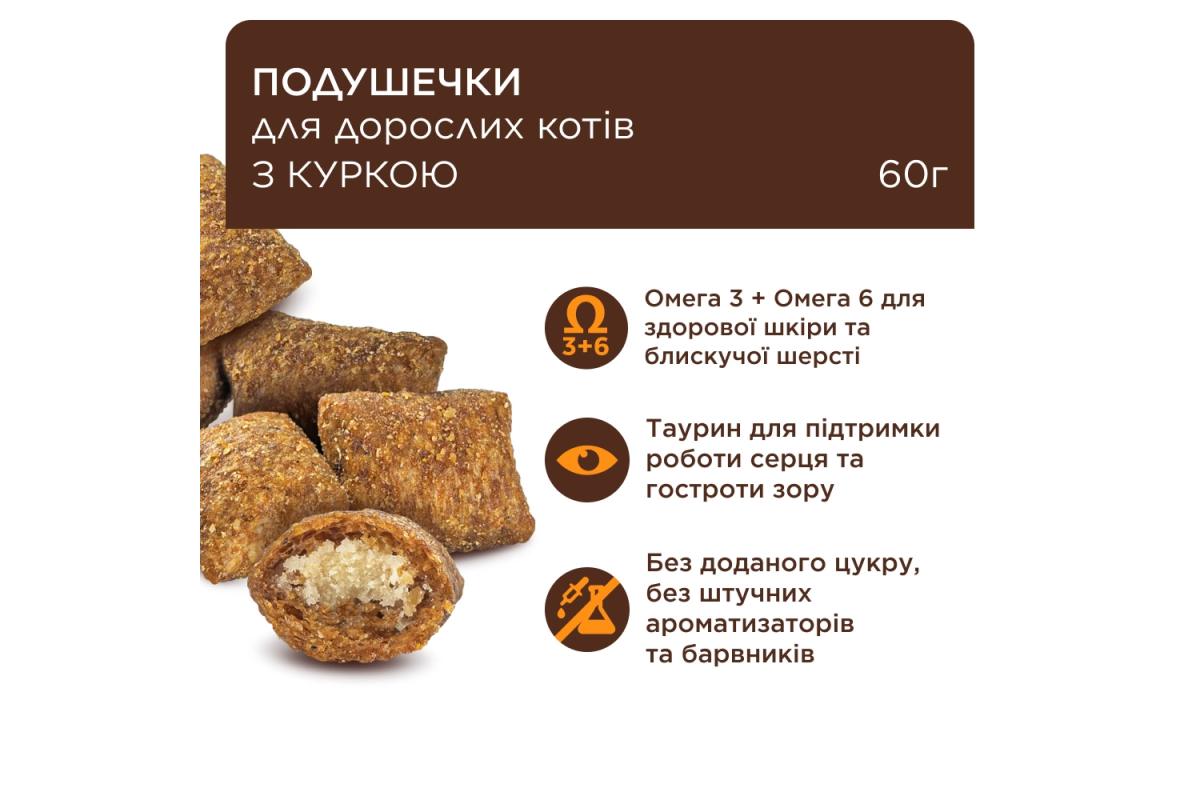 Ласощі для котів у вигляді хрустких подушечок зі смаком курки та ніжним наповненням в середині. Продукт наповнений комплексом ненасичених жирних кислот Омега 3 + Омега 6, що підтримує шкіру здоровою, а шерстьблискучою.