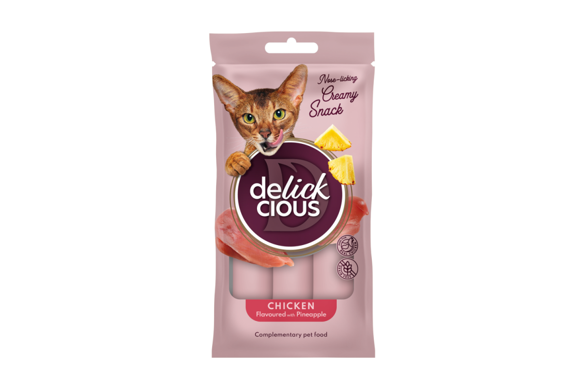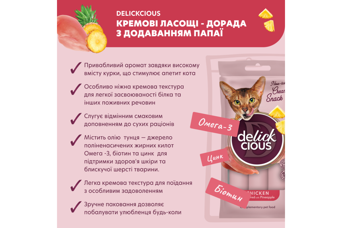 Delickcious Chicken Flavoured with Pineapple кремові ласощі – курка з додаванням ананасу. Додатковий корм для котів.