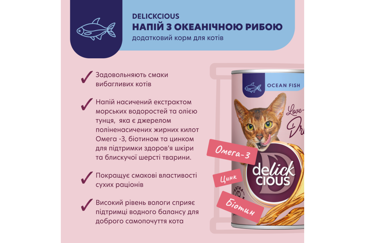Delickcious Ocean Fish напій з океанічною рибою. Додатковий корм для котів.