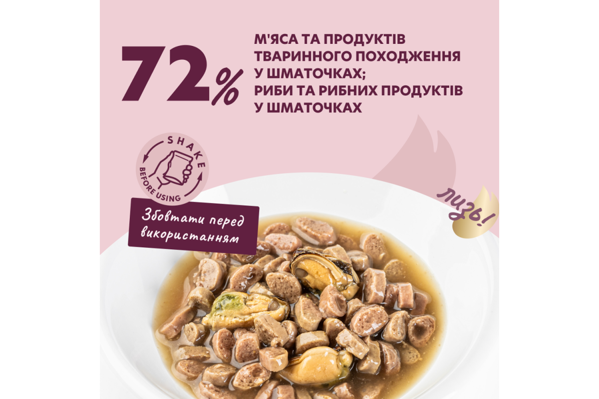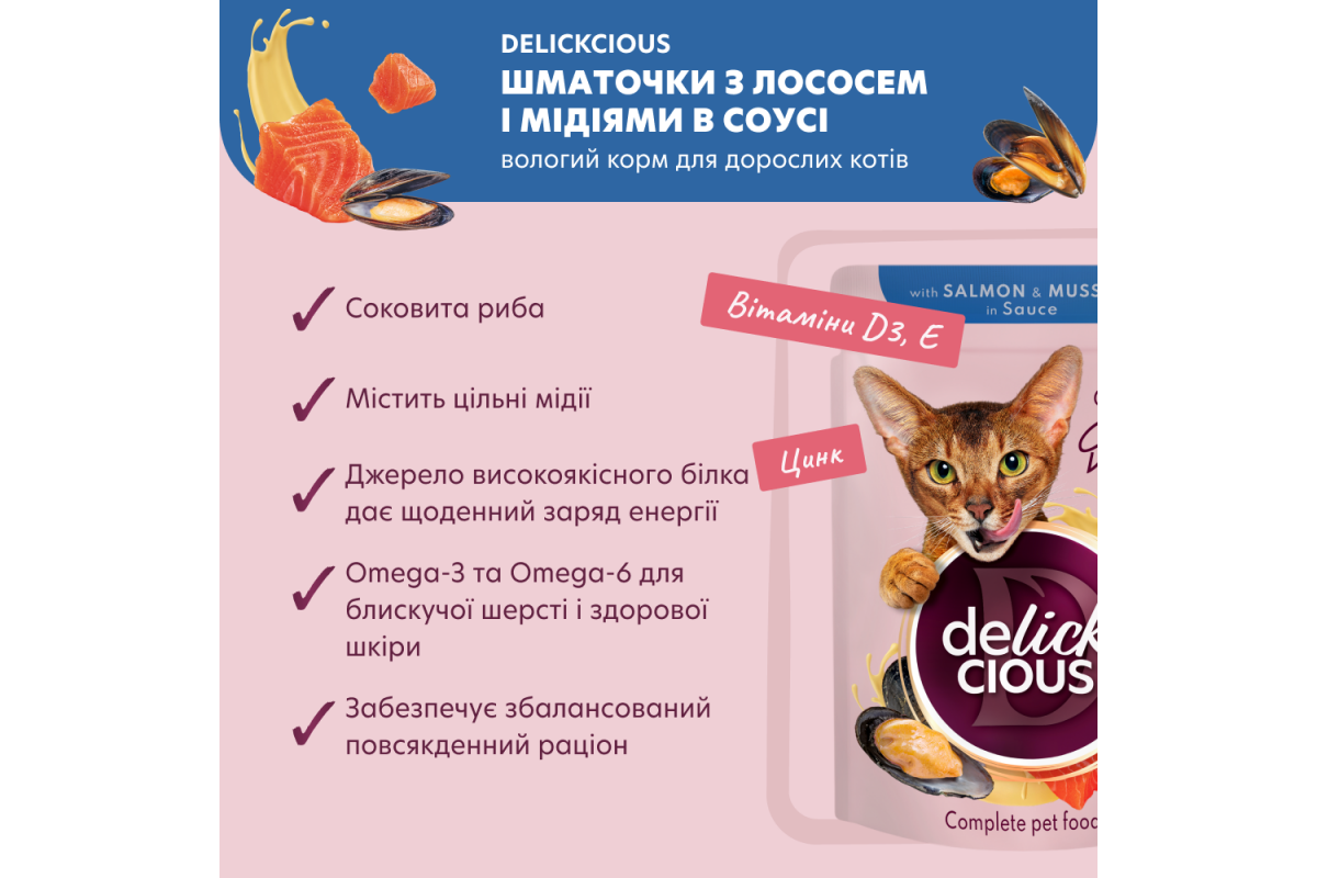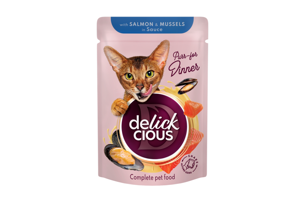 Вишуканий делікатес для справжніх поціновувачів риби — соковитий лосось у поєднанні з ароматними мідіями в кремовому соусі у консервованому кормі зручного формату, що дозволяє зберігати усі корисні властивості раціону і дарує коту чисту насолоду від їжі. А шовковистий соус, яким огорнуті рибні шматочки, підкреслює природний насичений смак. Підходить для годування на регулярній основі. Делизькатес Delickcious. Не просто їжа, а вау-лизь!