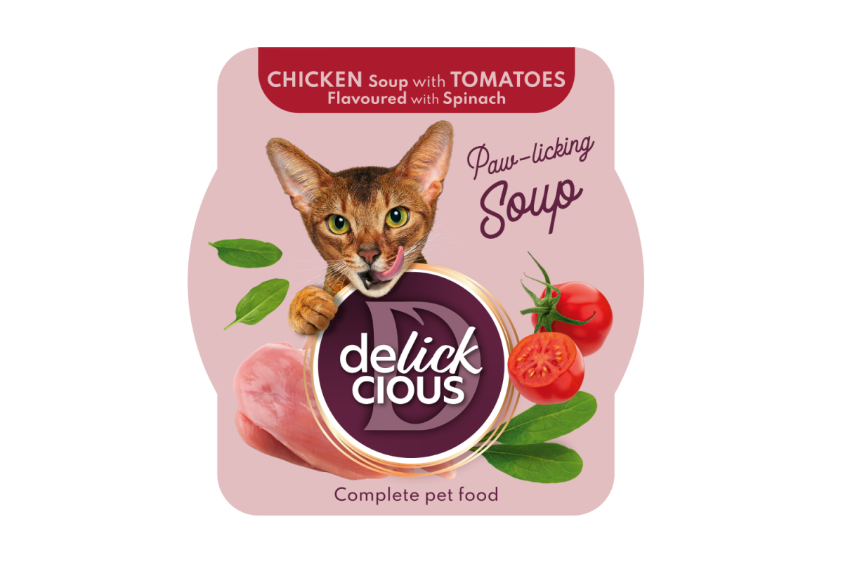 Коли їжа вже закінчилася, але кіт продовжує облизувати мисочку — це про наші супи. Апетитна курка зі стиглими томатами і зеленим шпинатом поєднані за спеціально розробленим рецептом для щоденного годування з нескінченною насолодою. Збережений смак, відбірні складники, баланс поживних речовин і різноманіття текстур дарують вашому коту задоволення від життя. Делизькатес Delickcious. Не просто їжа, а вау-лизь!